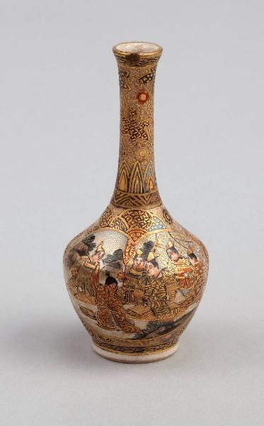 Piccolo vaso a smalti policromi e oro dal ventre basso e spalla alta terminante in un lungo collo dal labbro strombato. Decorazione a due cartelle con figure di dame e samurai. Fondo di tipo "nishiki", a broccato.