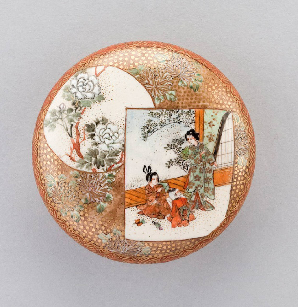 Scatola circolare con coperchio. A smalti policromi e doratura con due riserve. Una, circolare, campita con peonie bianche, una rettangolare, con dame e bambino. Internamente decorata con fiori bianchi.