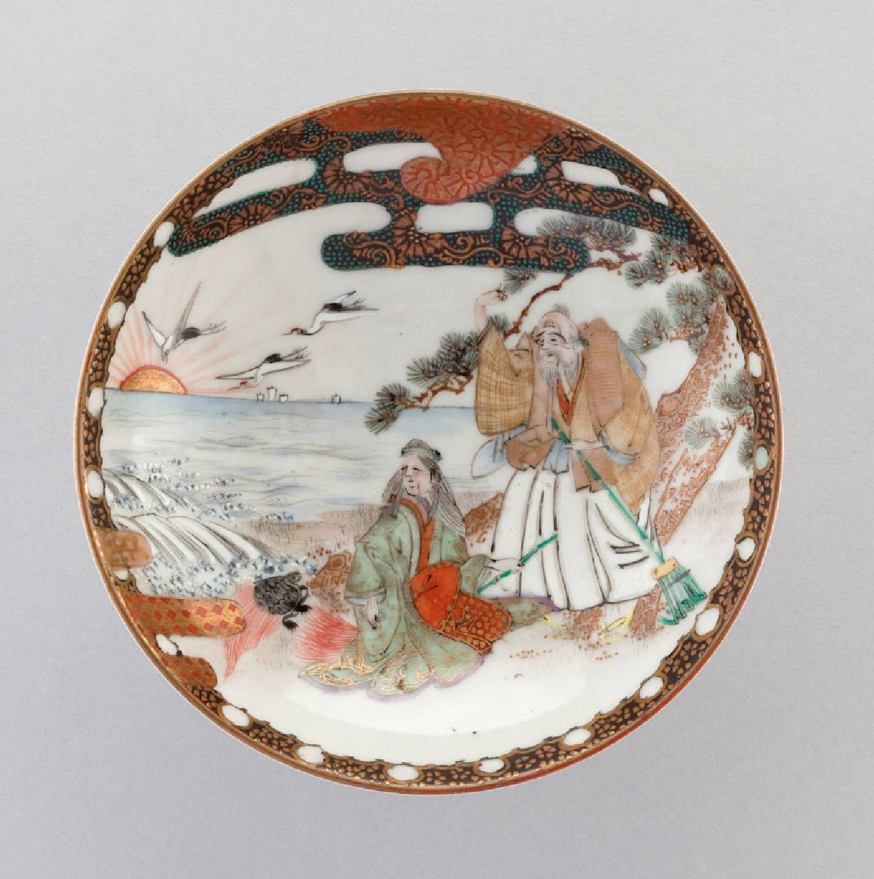 Coppetta da sake (sakazuki), o piattino fondo a parete curva, con alto piede circolare, decorato a smalti policromi con figure di anziani (Kanzan e Jittoku) di fronte ad un paesaggio marino al tramonto. Al lato, vicino ad una cascata, una tartaruga dei diecimila anni.