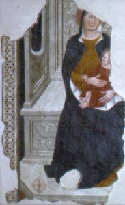 La Madonna, frontale, siede sul trono marmoreo decorato; tiene tra le braccia Gesù Bambino, di profilo, seduto sulle sue ginocchia. A sinistra, resti del fregio con decorazione cosmatesca.