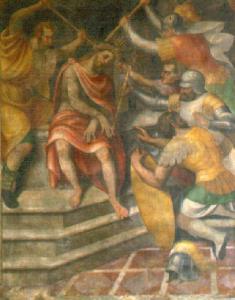 Assiso sui gradini di una scalinata, circondato da cinque aguzzini, Gesù è coronato di spine: il suo volto è mesto ed il capo è reclinato verso destra.