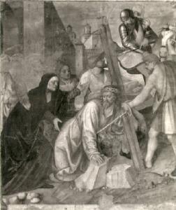 Al centro è Gesù, caduto sotto il peso della croce, che si volge a sinistra, dove è la Vergine, sorretta dalle pie donne. A destra sono altri due personaggi che intervengono per aiutare Gesù a rialzarsi, ed un armato a cavallo. Sullo sfondo è una città murata.