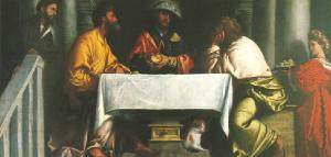 Al centro, seduto ad un tavolo con stelo di legno, tovaglia bianca e poche stoviglie, è Gesù Cristo, che, frontale, con cappello da pellegrino, barba e mantello con conchiglia sulla spalla sinistra, spezza il pane e guarda verso lo spettatore. A sinistra è seduto un apostolo visto di tre quarti, con barba e braccio sinistro piegato sul tavolo; dietro, al culmine di una scala con balaustra di marmo, si sporge e osserva la scena un gentiluomo, visto di tre quarti, con barba e copricapo, che si appoggia sul braccio sinistro piegato sul parapetto. A destra è seduto l'altro apostolo, scorciato, con barba e gomito sinistro puntato sul tavolo per reggere con il palmo della mano il viso volto a Gesù; dietro, più in basso, è una giovane donna con copricapo, vista di scorcio, che volge lo sguardo verso lo spettatore e solleva davanti a sé un piatto di metallo con cibo. Sotto il tavolo, sulla base dello stelo, è un gatto. La scena si svolge in una sala con colonne in prospettiva.