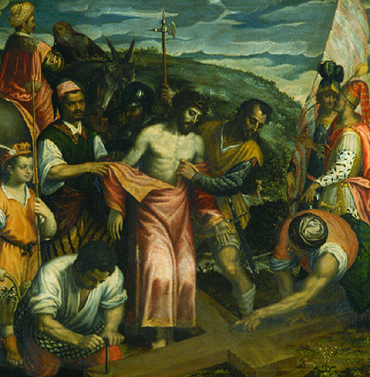 In piedi al centro Gesù Cristo è spogliato della tunica da due sgherri davanti alla croce stesa in terra dove un operaio sta praticando un foro e l'altro prende le misure. A destra e a sinistra altre figure di soldati e di inservienti. In secondo piano armigero con armatura e alabarda; a sinistra due uomini a cavallo.