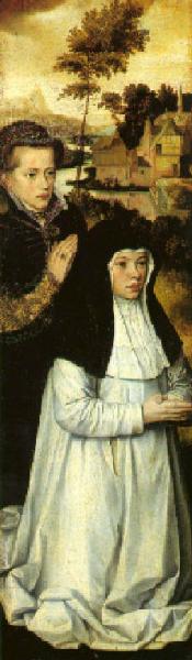 In primo piano, inginocchiata, e volta verso destra è una monaca, il giovane viso incorniciato dal velo nero sul cui margine inferiore sinistro si vede una piccola croce; tiene le mani giunte, le pieghe della veste ricadono in terra a raggiera; in secondo piano si trova una figura di donna, presumibilmente stante, anch'essa in preghiera volta verso destra e riccamente abbigliata, con cuffia impreziosita da gioie, abito scuro con collo di pizzo, maniche di broccato in oro. Alle spalle dei personaggi, è un paesaggio con un case affacciate sulle anse di un fiume.