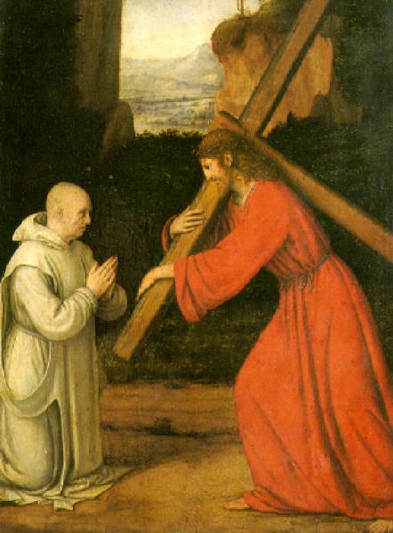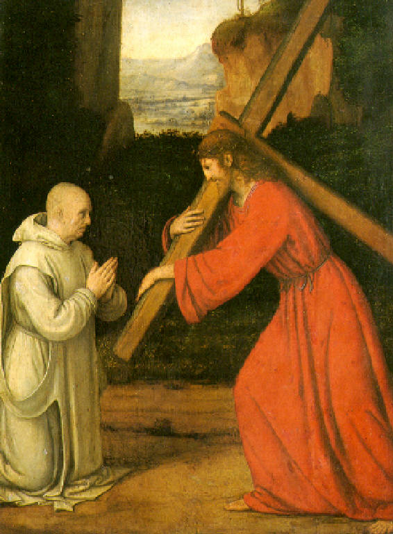 Gesù Cristo di profilo in primo piano avanza verso sinistra portando sulle spalle la pesante croce di legno; inginocchiato di fronte a lui è un frate certosino in preghiera. Sullo sfondo paesaggio.