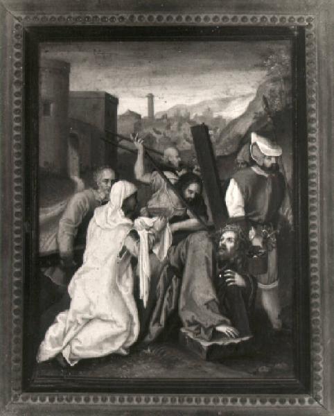 In primo piano, Gesù è piegato sotto la croce che regge con una mano, mentre l'altra si appoggia ad un sasso piatto; a sinistra, la Veronica, con un lungo abito e posta di profilo, corre verso il Cristo porgendogli il panno; in secondo piano, un manigoldo incalza il condannato, un'altra figura barbuta sorregge la croce, un armato sulla destra sembra attendere, un uomo porta una scala; sullo sfondo, veduta di città e mura urbiche.