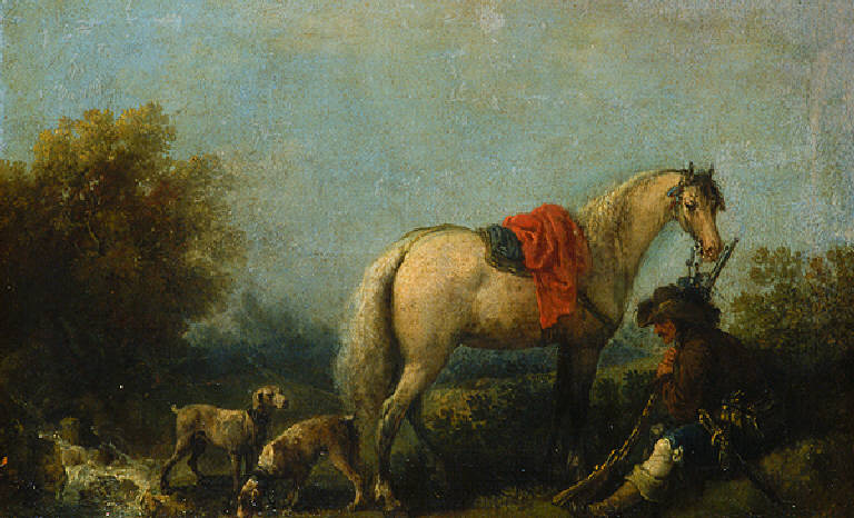Al centro un cavallo sellato di profilo, con il muso volto verso sinistra; a destra è un cacciatore di profilo con entrambe le mani strette alla lunga canna del fucile e cappello piumato, seduto; a sinistra due cani da caccia. Alle opposte estremità, due folti cespugli incorniciano la scena\n.