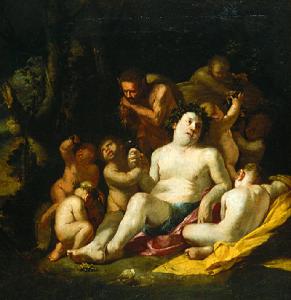 Bacco ebbro con satiro e putti