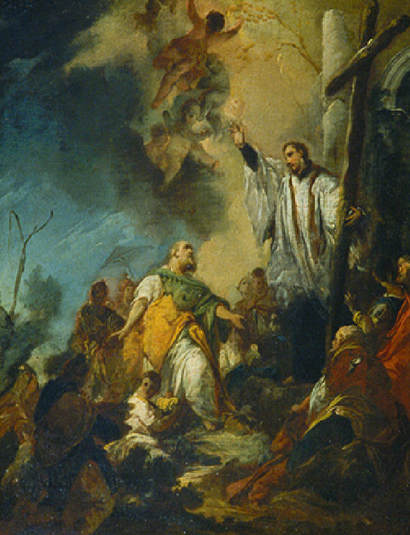 Sulla destra, presso un'architettura diruta, si trova il santo vestito di cotta nell'atto di sostenere con una mano la croce, mentre l'altra è sollevata; di fronte al predicatore, una figura di vecchio barbuto e drappeggiato altri personaggi assistono alla scena, mentre in alto è uno stuolo di angeli fra le nuvole.