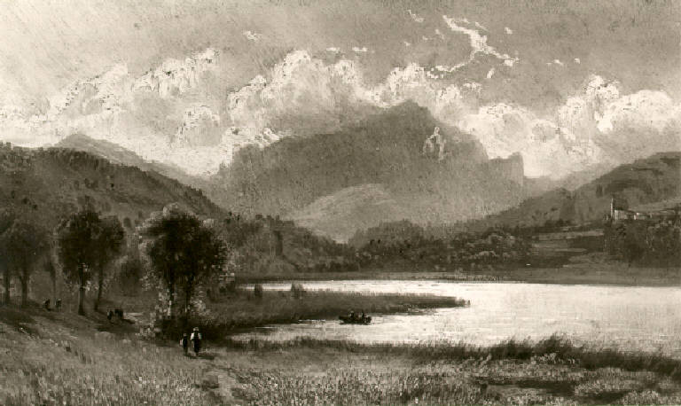 A sinistra, lungo un'ansa della sponda, figure e animali tra gli alberi; nell'acqua una piccola barca, sullo sfondo montagne e un paese.