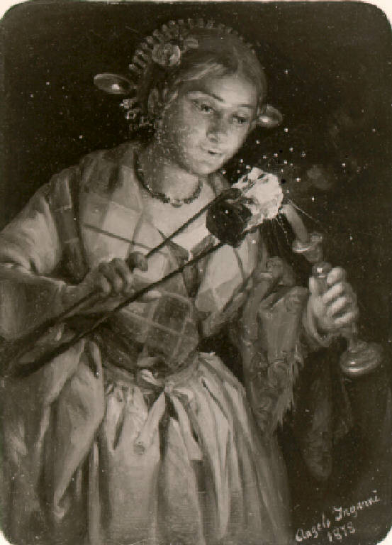 Una contadina rivolta di tre quarti verso destra, tiene nella mano sinistra una candela e nella destra un tizzone.