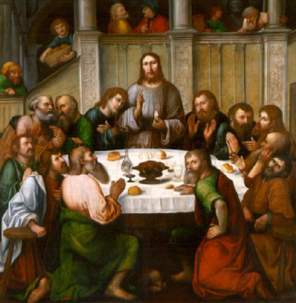 Gesù Cristo al centro in piedi presso un tavolo rotondo cui sono seduti gli apostoli benedice il pane dell'ultima cena. In secondo piano una scala conduce ad una loggia, animata da alcune figure che si affacciano per osservare la scena.