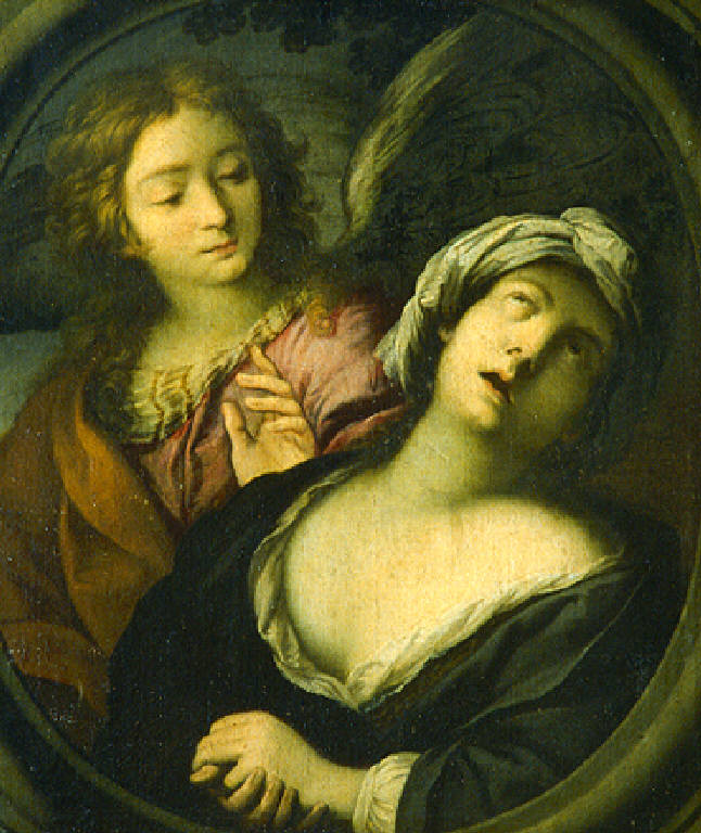 In primo piano a destra la santa ha il capo leggermente piegato all'indietro e cinto di un panno, la bocca è dischiusa, l'abito lascia intravedere il torso, le mani sono unite davanti al petto. Alle spalle della donna, un angelo volge la lunga testa chiomata verso di essa e solleva la mano destra in segno di benedizione.