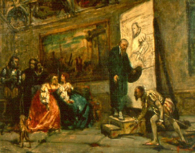 In una stanza in cui alcuni dignitari e dame assistono alla realizzazione del ritratto, Carlo V si china per raccogliere il pennello a Tiziano.