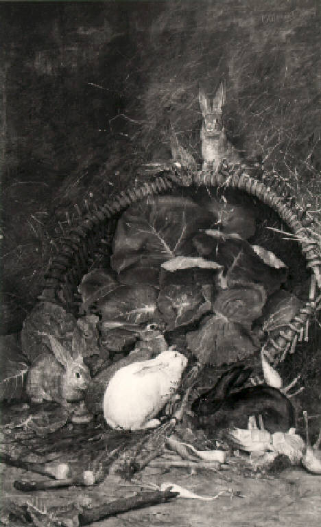 Attorno ad un cesto di verdura rovesciato nel fieno stanno conigli intenti a mangiare.