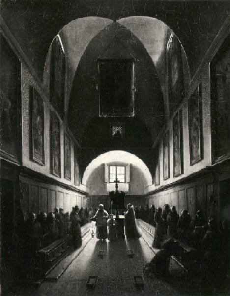 Di fronte ad un leggio posto al centro del coro due religiosi ed un chierichetto; ai lati i monaci disposti negli scranni del coro; dalle volte pende uno stendardo devozionale.