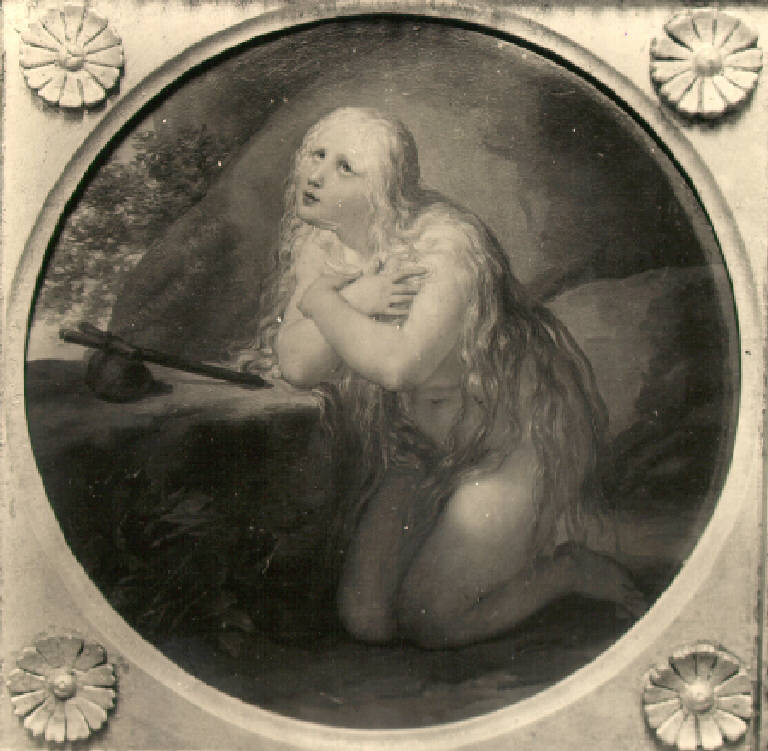 La Maddalena, coperta solo dai lunghi capelli, è inginocchiata accanto ad un masso sul quale è appoggiato un crocefisso, tiene le braccia incrociate sul petto; alle sue spalle paesaggio roccioso e le fronde di un albero.