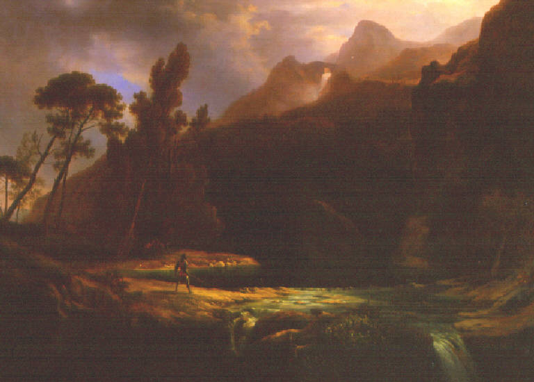 Fermo sulle sponde di un lago Ferraù osserva lo spettro di Argalia che, emerso dalle acque, gli porge l'elmo cadutogli nel fiume; attorno paesaggio montuoso con rupi ed una cascata.