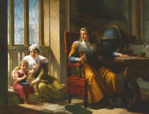 Al centro Newton, seduto al tavolo, si volge verso sinistra per osservare una donna ed un fanciullo che, seduti a terra davanti alla finestra, stanno facendo le bolle col sapone; sopra la testa del bambino una grossa bolla; sparsi per lo studio numerosi libri.