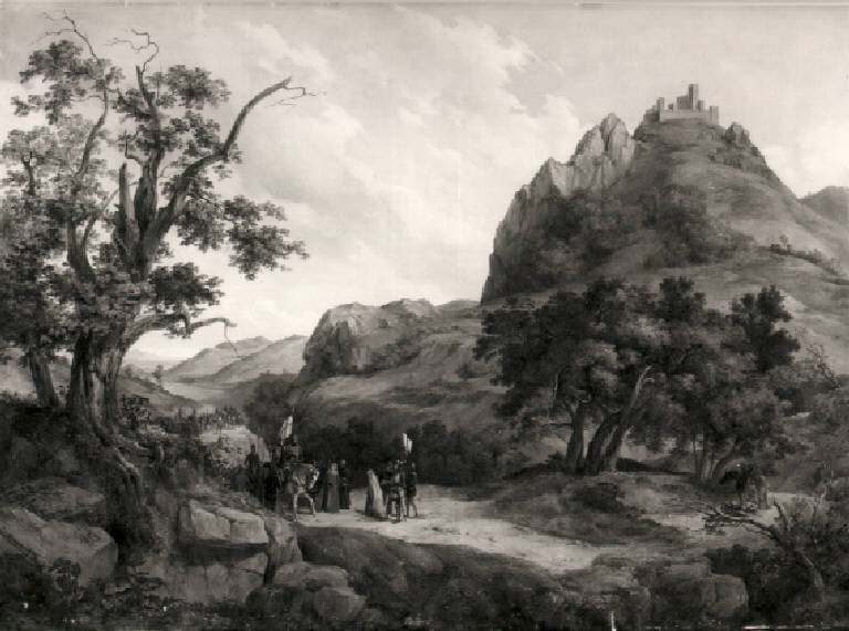 In basso a sinistra una schiera di armati con il vessillo crociato cui si fa incontro una donna velata scortata da tre uomini con armatura; sullo sfondo paesaggio con boschi e un castello sul colle.