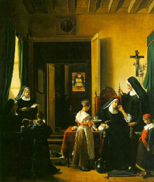 A destra una suora in atteggiamento sofferente riceve le attenzioni da delle consorelle, al suo fianco una giovane servente le porge una tazza di caffè.