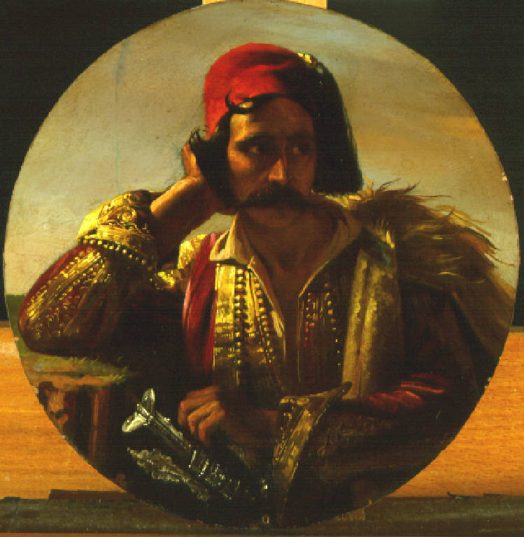 Uomo giovane, con lunghi baffi; vestito all'orientale indossa una camicia bordata di perle, una giacca ricamata ed un mantello di pelo; porta sulla testa un cappello desinente con fez.