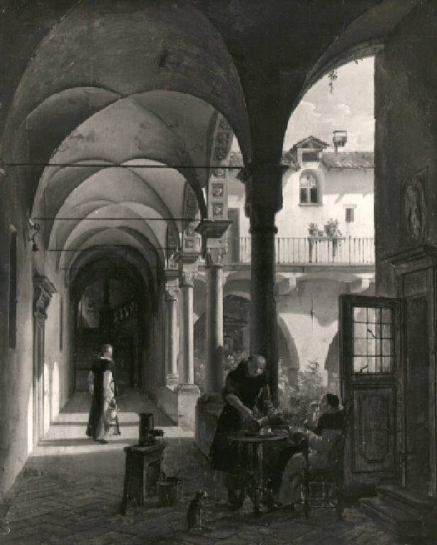 Sotto le volte di un chiostro un converso serve da bere ad un frate seduto ad un tavolino, vicino a loro un fornello ed un cane; sullo sfondo paesaggio con un frate e il giardino del chiostro.