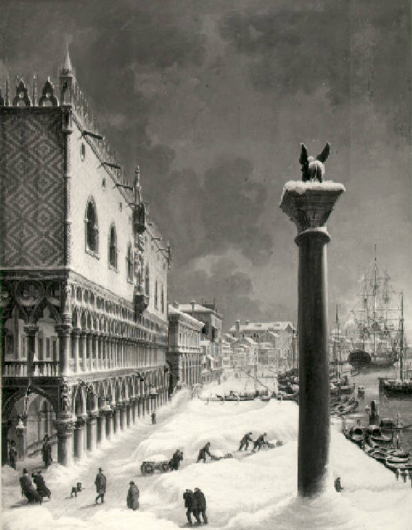 A sinistra il Palazzo dei Dogi visto di scorcio, a destra la colonna con il leone ed il Canal Grande, sullo sfondo gli edifici dell'Arsenale; la neve ammanta la città e le barche in mare.