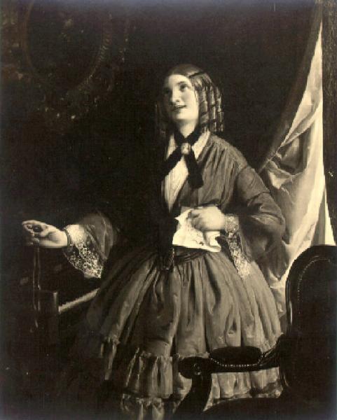 All'interno di un salotto una giovane donna, a figura intera in piedi, tiene con la mano destra un medaglione con un ritratto maschile barbuto e con la sinistra stringe al petto una lettera; alle sue spalle una finestra con pesanti tendaggi, alla parete un quadro, in primo piano una poltrona con braccioli in legno.