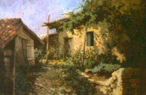 Due case rustiche in campagna, ai lati di una stradina; quella di destra ha intorno una vite rampicante; sempre a destra, in primo piano, muretto.\n.