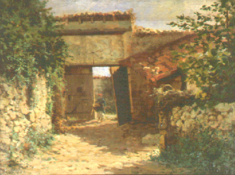 Alla fine di un viottolo costeggiato da muri, ingresso di una casa di contadini con portone di legno aperto dal quale sta uscendo una donna che regge un cesto (?) tra le mani.