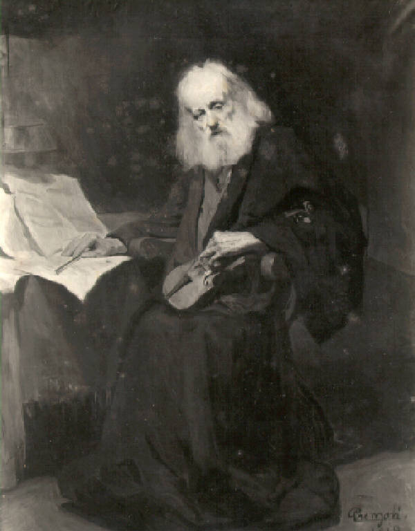 In un interno, accanto ad un tavolo, è seduto di tre quarti un vecchio dai lunghi capelli, il viso volto verso il riguardante, una mano poggia sul tavolo ingombro di fogli, l'altra tiene un violino.