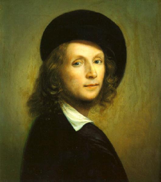 Giovane uomo con capelli biondi e copricapo nero, busto di profilo e testa di fronte.