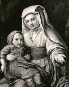 La Madonna seduta tiene tra le braccia Gesù Bambino e lo mostra a chi guarda con un gesto del braccio destro.