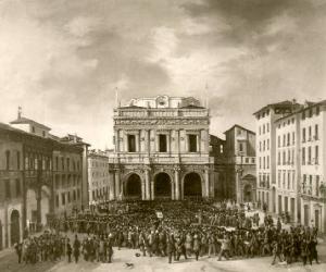 Gruppi di cittadini davanti al Palazzo della Loggia che termina con dall'attico progettato dal Vanvitelli; a sinistra in basso si può vedere la statua della Lodovica.