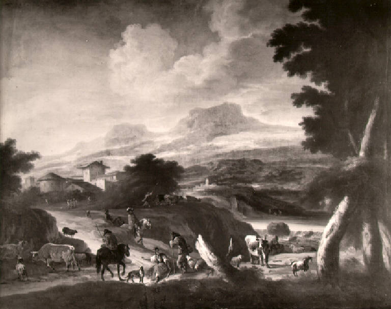 In primo piano, sulla sinistra, sono alcune figure di pastori con mucche, capre e cani; a destra, due grandi alberi si incrociano e fungono da quinta; sullo sfondo, nell'ampia vallata, veduta di città.
