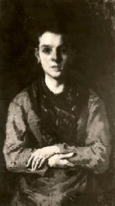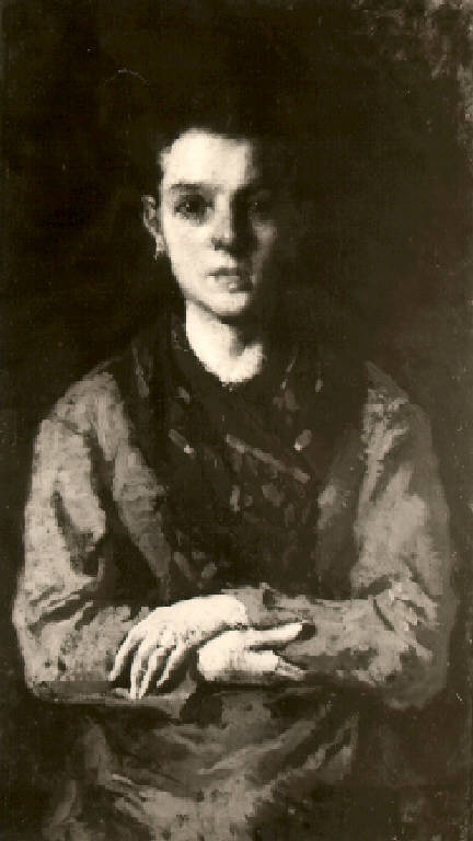 La donna in posizione frontale, con la braccia conserte, i capelli raccolti, intorno al collo un fazzoletto.