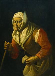 La vecchia curva è posta di tre quarti, ha il capo coperto da un fazzoletto annodato sotto il mento sporgente; la mano sinistra si appoggia su un bastone, la destra sorregge un lembo del grembiule.