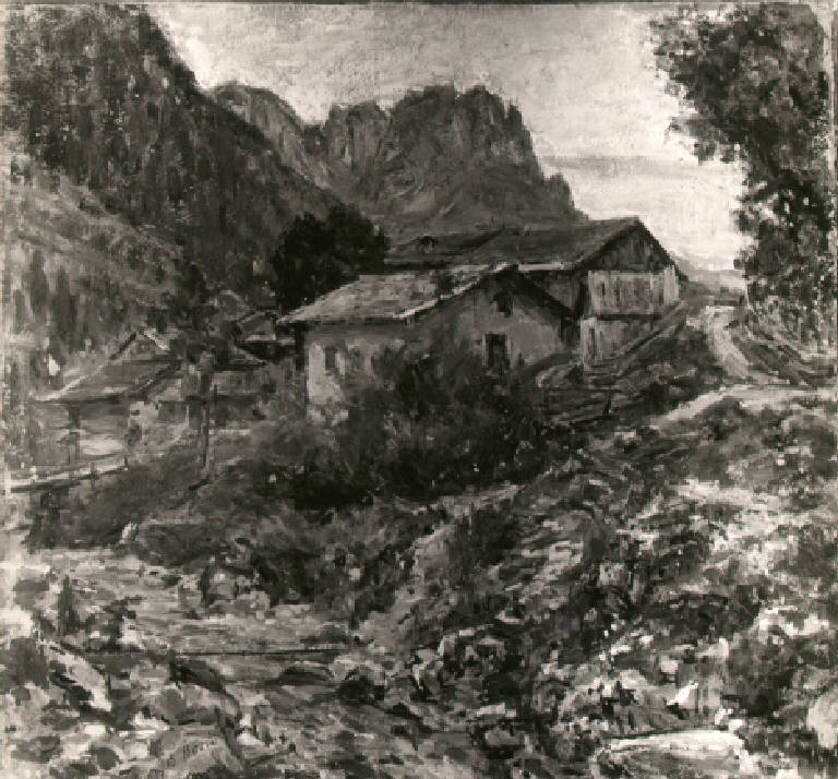 Gruppo di case di montagna presso un torrente, attraversato da un piccolo ponte. Sullo sfondo declivio con bosco di conifere e cime delle Dolomiti.