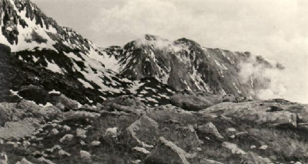 Cime di montagne coperte di neve, avvolte dalle nuvole.