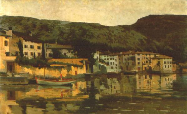 Gruppo di case con giardini che si specchiano nelle acque di un lago dove è ancorata una barca; nello sfondo, il profilo delle montagne.