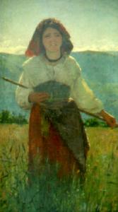 Giovane ragazza, in posizione frontale, in piedi in un campo di grano: indossa una veste rossa con corpetto e una camicia bianca, un grembiule e sul capo ha un fazzoletto; tra le mani tiene un bastoncino passato dietro la schiena; il profilo delle montagne fa da sfondo alla scena.