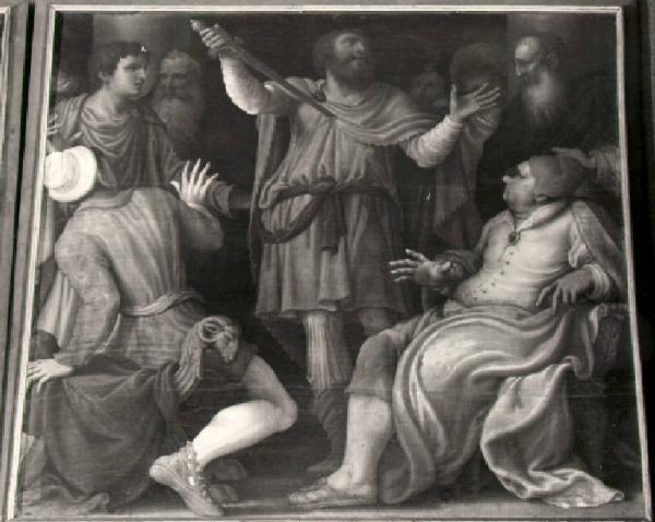 In piedi al centro, Caronda di Tiro si configge una spada nel petto; in primo piano, a destra e a sinistra, due personaggi seduti guardano la scena spaventati. In terzo piano altre figure in piedi assistono al suicidio.\n.