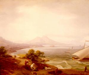 In primo piano due uomini ed una donna con in braccio un fanciullo, a destra, sul mare agitato, delle barche; sullo sfondo paesaggio con Napoli e il Vesuvio fumante.