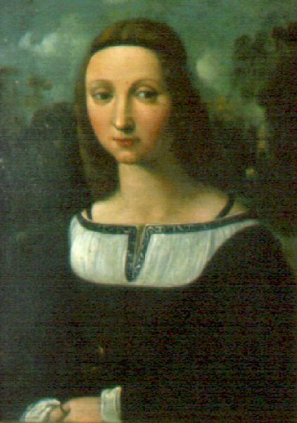 Busto di tre quarti di giovane donna, che indossa un abito scuro ed ha i lunghi capelli sciolti trattenuti da un nastro sulla testa. Sul fondo paesaggio con alberi.