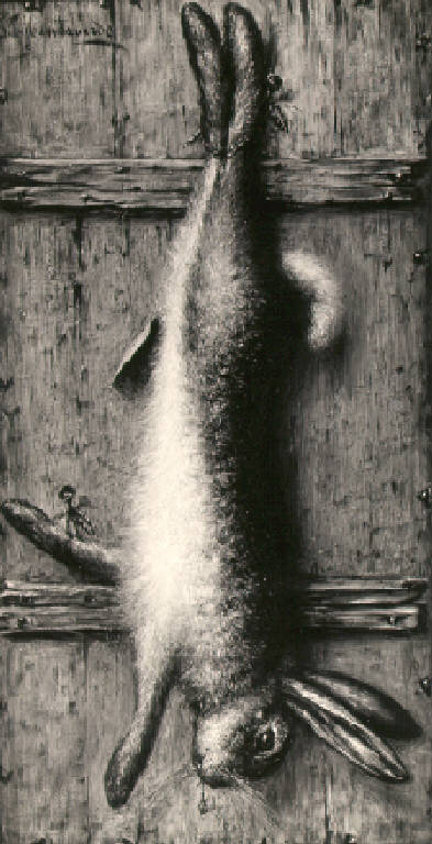 La lepre è appesa a testa in giù per le zampe posteriori ad una anta formata di pannelli di legno.