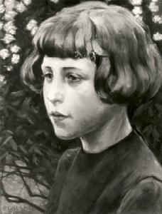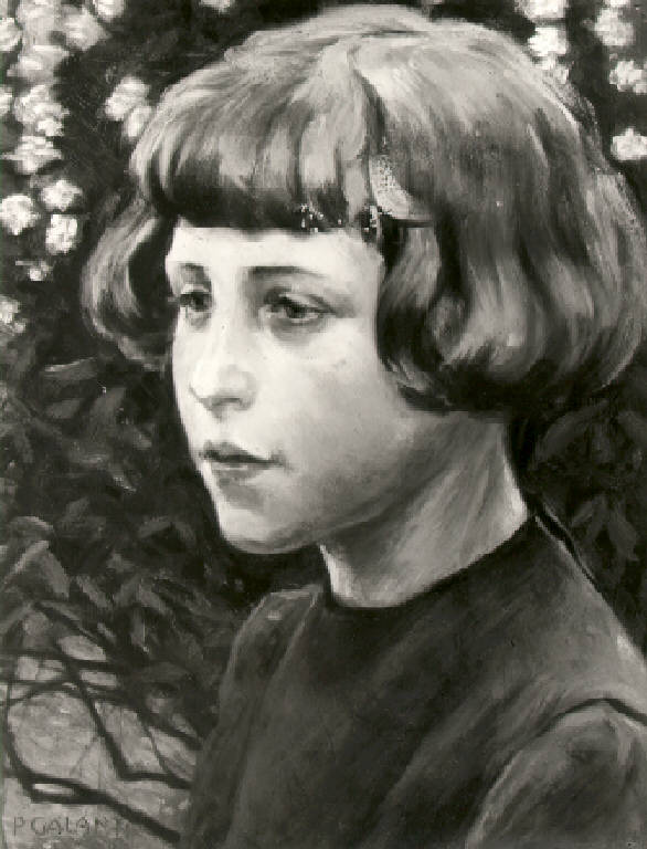 Bambina a mezzo busto, di tre quarti verso sinistra, con vestito accollato e capelli corti, davanti a cespuglio con fiori.