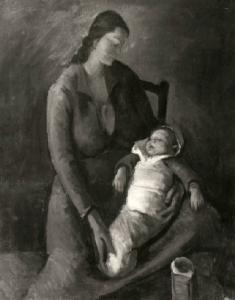 La donna è seduta su una sedia e posta di tre quarti, lo sguardo rivolto verso il bambino addormentato che tiene sulle ginocchia.