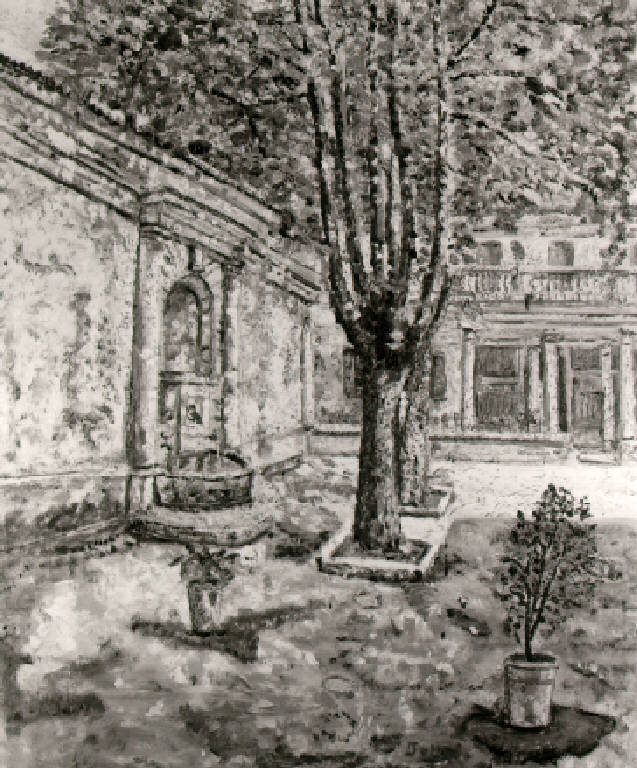 Il cortile è cintato e sulla sinistra è una fontana entro arco, la parete di fondo è costituita da un loggiato; al centro della veduta, due alberi, in primo piano vasi con piante.